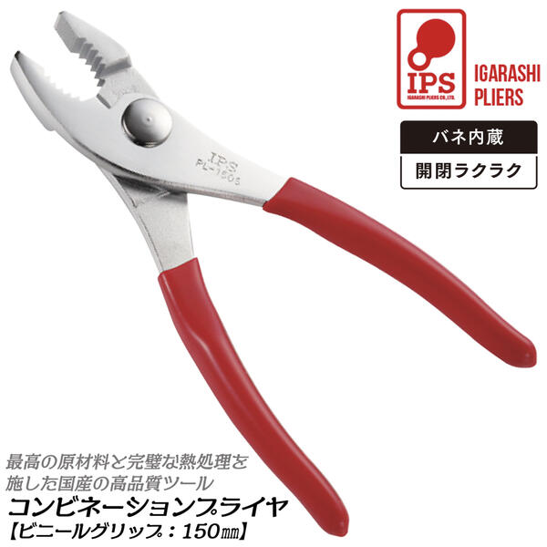 IPS PLIERS コンビネーションプライヤ 150mm バネ付き ビニールグリップ付 口開き2段 掴む 挟む 回す 切る DIY 針金切り PL-150SG 五十嵐プライヤー