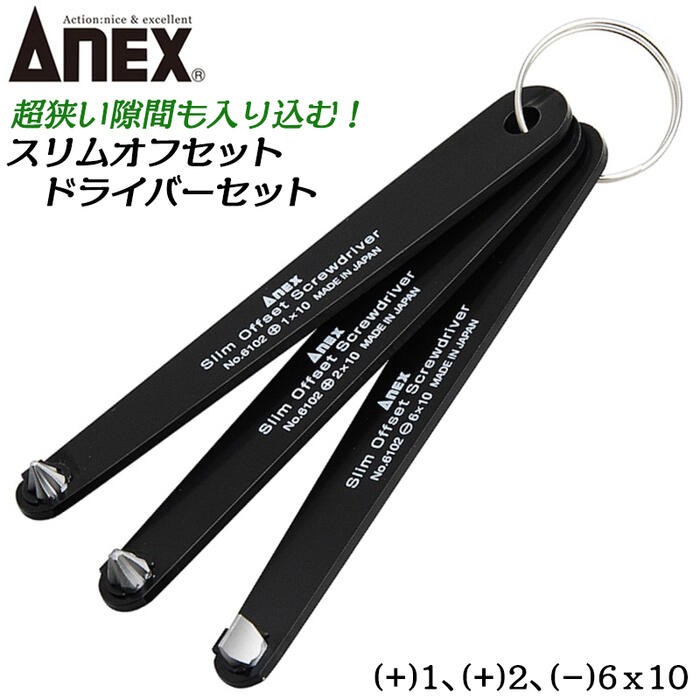 ANEXTOOL 3本組スリムオフセットドライバーセット +1X10mm +2X10mm -6X10mm 回す 締める 緩める プレート形状 プラスド マイナス日本製 #6102-T 兼古製作所