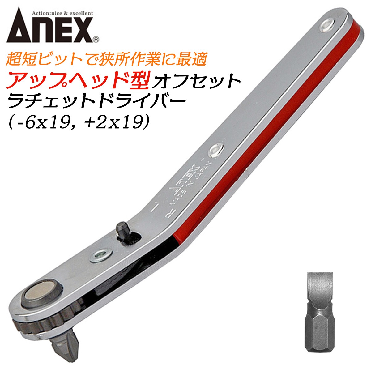 ANEX 超短ビット付オフセットラチェットドライバー アップヘッド型 上曲がりハンドル ネジ回し 狭い箇所 超薄型ヘッド ラチェット機構 ベント型 #426 兼古製作所