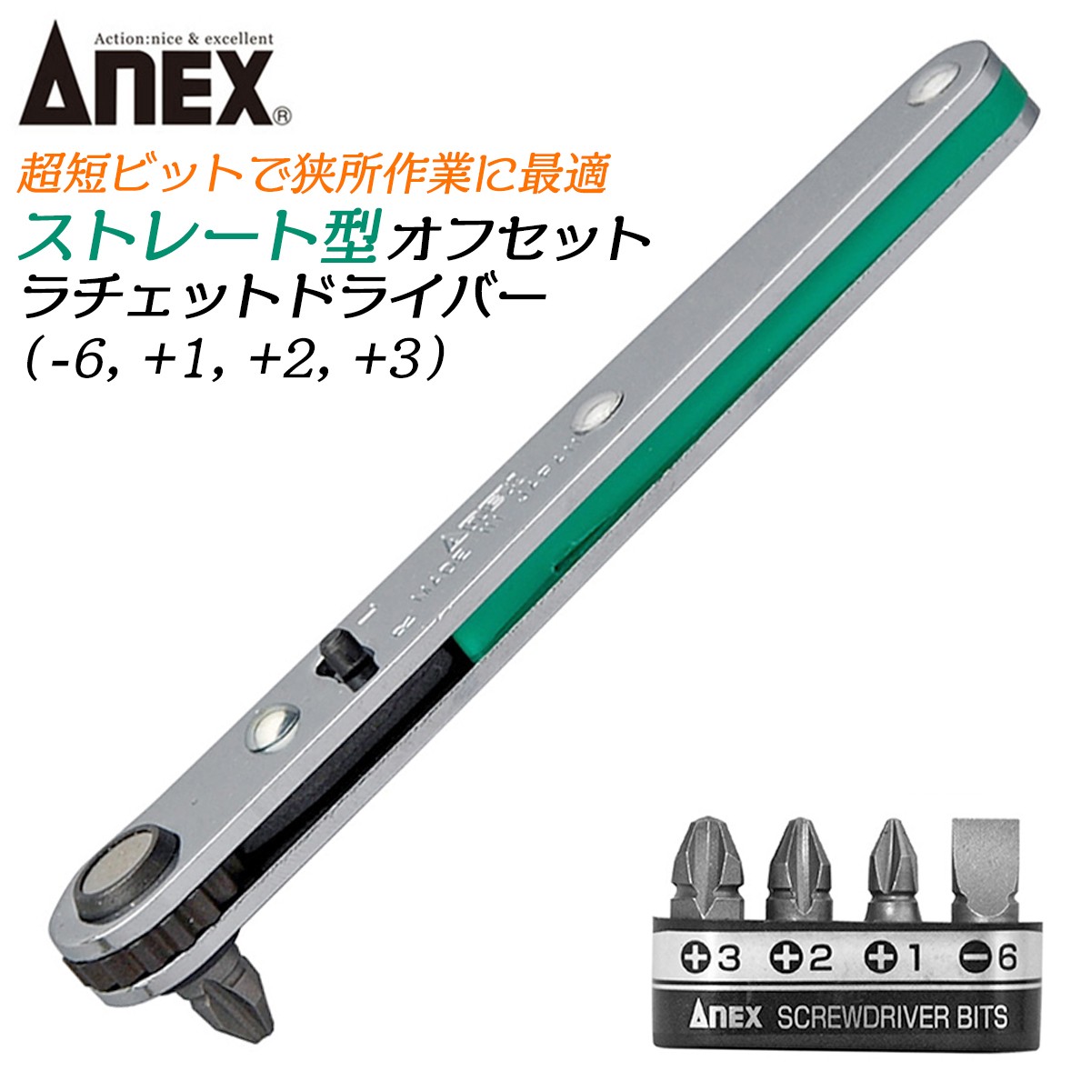 ANEX 超短ビット付オフセットラチェットドライバー ストレート型 ラチェットハンドル ネジ回し 狭い箇所 超短 超薄型ヘッド ラチェット機構 #425-5B 兼古製作所