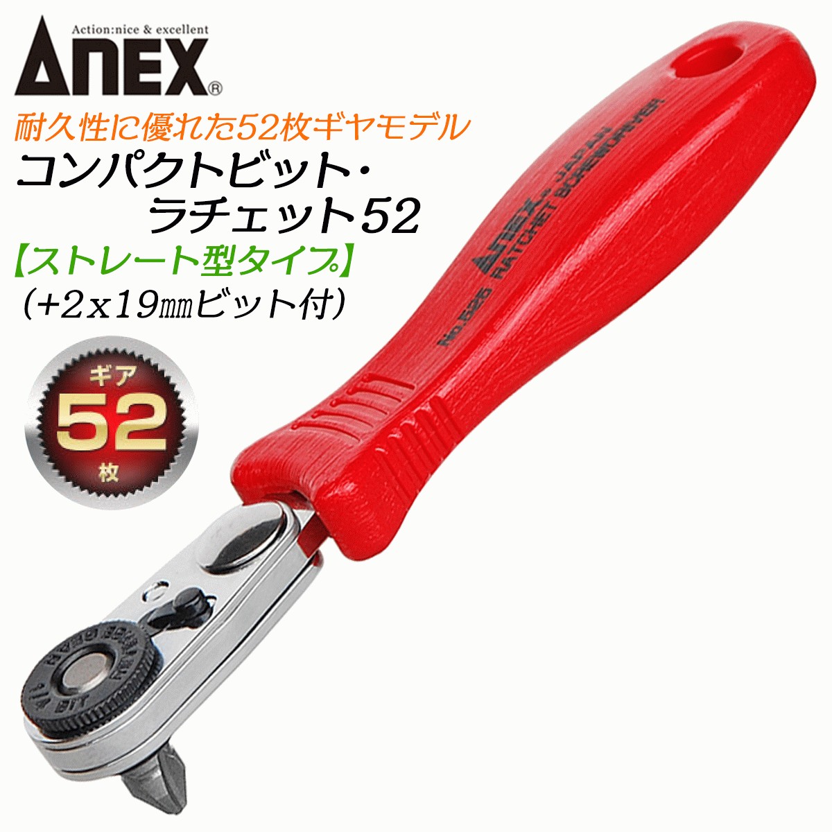ANEX コンパクトビット ラチェット52 ストレート型 52枚ギア ビット差し替え式ドライバー ネジ回し 狭所 超短 薄型ヘッド 早回し #525 兼古製作所