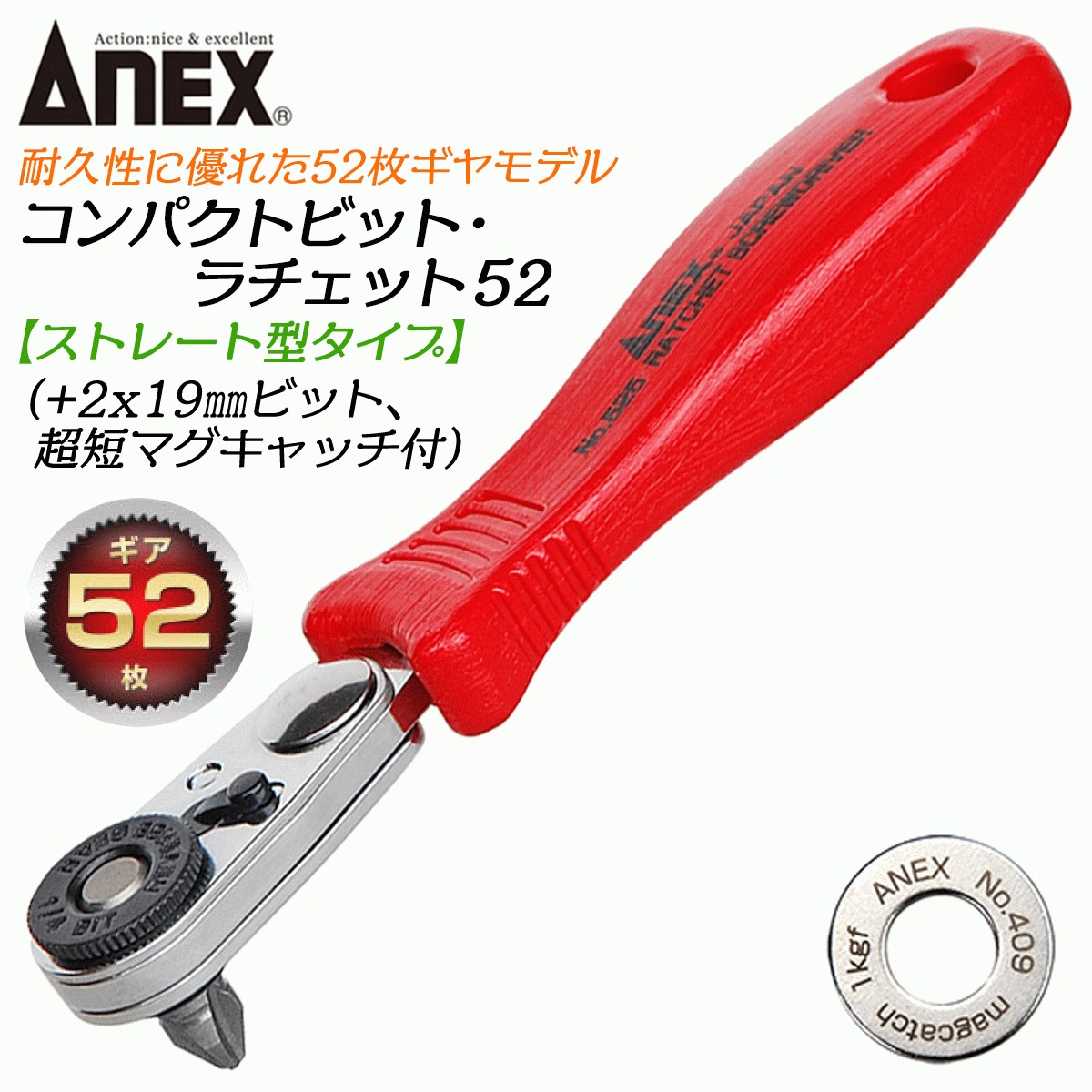 ANEX コンパクトビット ラチェット52 ストレート型 52枚ギア 超短マグキャッチ付 ビット差替式ドライバー ネジ回し 狭所 薄型ヘッド #525-M 兼古製作所