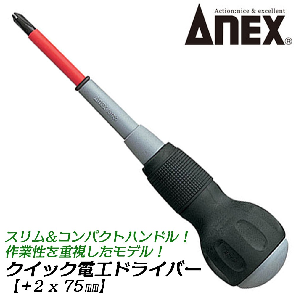 ANEXTOOL クイック電工ドライバー +2X75mm 小型ハンドル採用 回転角度大 配電盤 ボールグリップ プラスドライバー 電気工事 電設 DIY #1720 兼古製作所