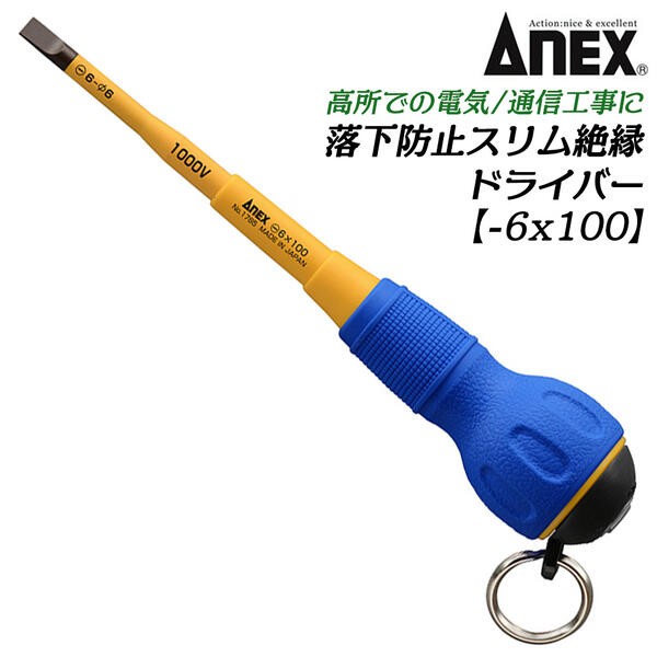 ANEX 落下防止スリム絶縁ドライバー -6x100 スリム先端 特殊マイナス形状採用 リング付 電気工事 電工 通信 高所作業 ボールグリップ No.1785 兼古製作所