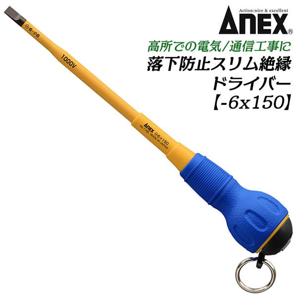 ANEX 落下防止スリム絶縁ドライバー -6x150 スリム先端 特殊マイナス形状採用 リング付 電気工事 電工 通信 高所作業 ボールグリップ No.1785 兼古製作所