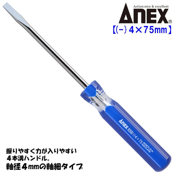 ANEXTOOL フォーラインドライバー -4X75mm 細軸タイプ 握りやすい 力が入りやすい 回す 締める 緩める マイナスドライバー #8300-4X75 兼古製作所