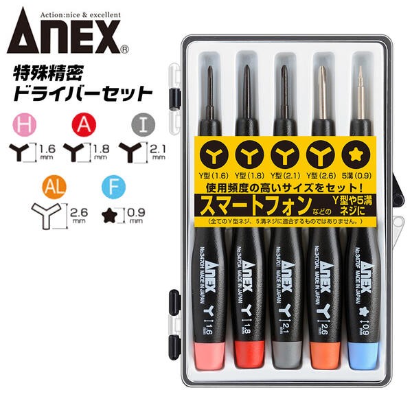 ANEX 特殊精密ドライバーセットY型/5溝 5本組 Y型 (1.6) Y型 (1.8) Y型 (2.1) Y型 (2.6) 5溝 (0.9) 精密ネジ 特殊ネジ プラスチック柄 #3475-S2 兼古製作所