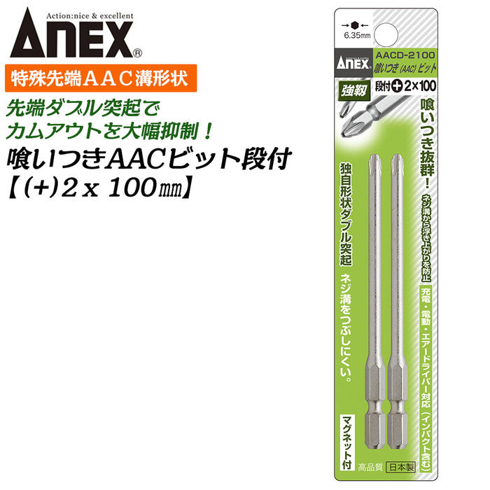 ANEXTOOL 喰いつきビット 段付き 2本組 +2X100mm マグネット付 カムアウト防止 ネジ溝を潰しにくい サビにくい メッキ処理 プラスビット AACD-2100 兼古製作所