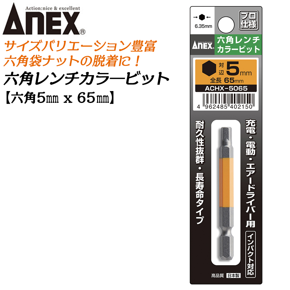 ANEX カラービット 6角レンチ 5mm 耐久性抜群 長寿命タイプ 色分けで先端サイズ識別 家具 機械 設備 組立 DIY 六角 日本製 ACHX-5065 兼古製作所