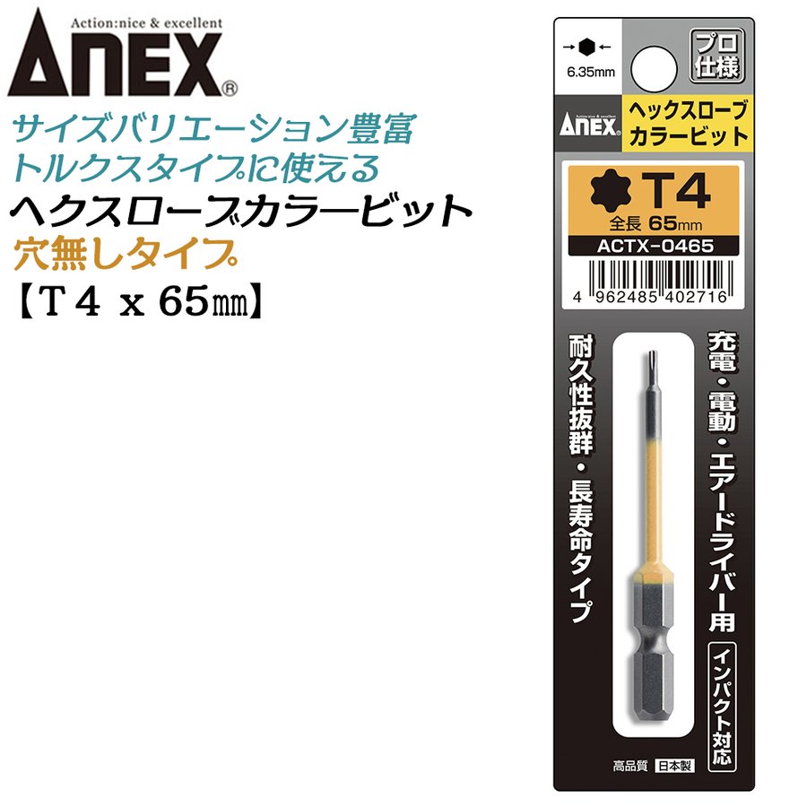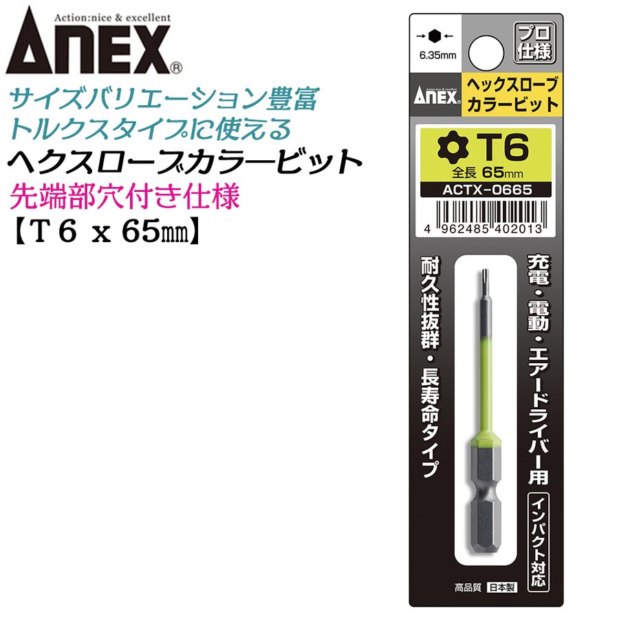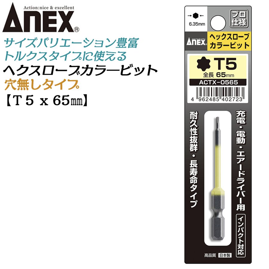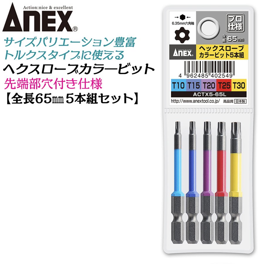 ANEX カラービット ヘクスローブ 5本組 T4 T5 T6 T8 T10 耐久性抜群 長寿命タイプ 家具 機械 設備 組立 DIY トルクス 日本製 ACTX5-65L2 兼古製作所