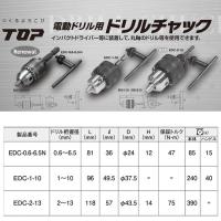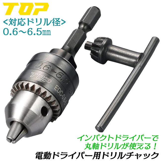 トップ工業 電ドル用ドリルチャック 0.6~6.5mm用 チャックハンドル付 丸軸ドリル インパクトドライバー対応 18V対応 6.35mm軸 日本製 EDC-0.6-6.5N TOP