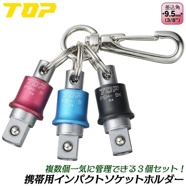 トップ工業 携帯用インパクトソケットホルダー 3個セット 差込角9.5mm用 3分ソケット対応 赤 青 黒 ナスカン付き ボール止め式 携帯 持ち運び PSH3-BRBKN TOP
