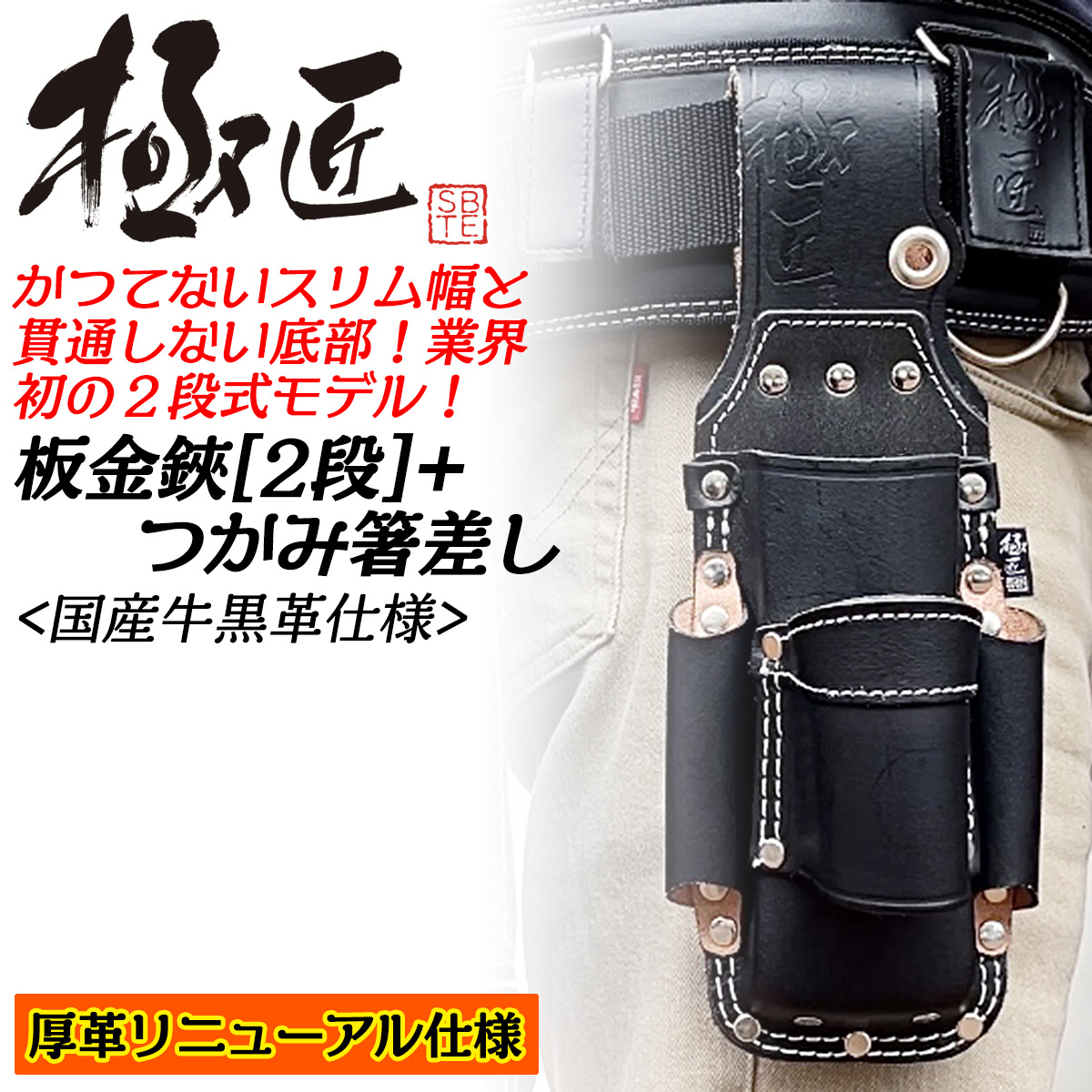 極匠 高級牛黒革 板金鋏[2段]+つかみ箸差し スリム幅 二重縫製 板金ハンマー差し付 傷防止樹脂 貫通しない 板金鋏ケース 工具差し GK-2DBA ベストツール