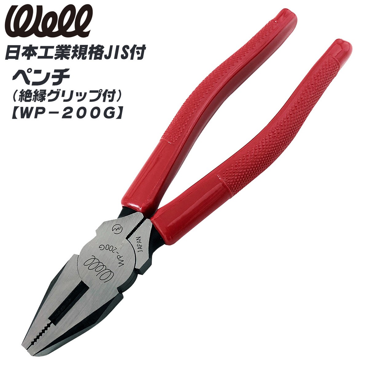 WELL 絶縁グリップ付ペンチ 200mm 滑り止め 掴む 曲げる 切る 挟む ねじる 切断 電工 電気工事 建築 設備 加工 機械 JIS規格 日本製 WP-200G ベストツール