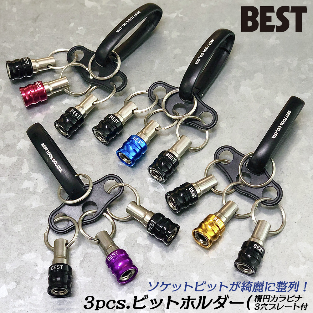 ベストツール 3pcs ビットホルダー オーバルカラビナ&3つ穴プレート付 カラフル ソケット ビット 携帯 管理 整列 軽量 楕円カラビナ付 3個入 BTH-3シリーズ