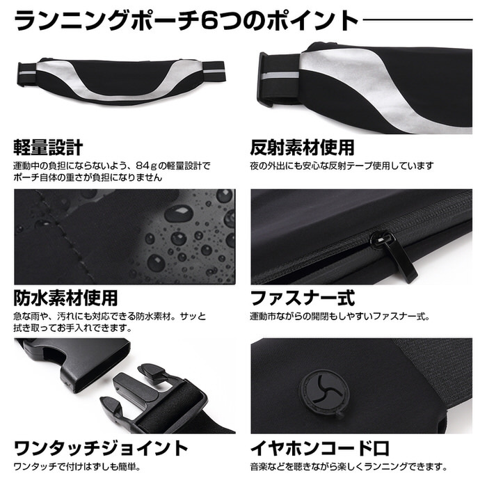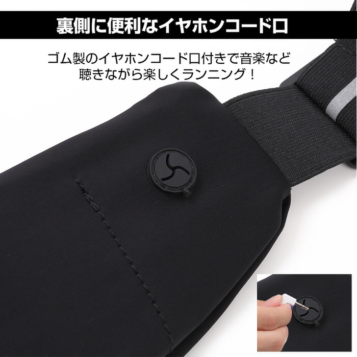 コンパクトながらもスマホやカード、鍵などの小物類やイヤホンなどランニングに必要なグッズは収納できる大きさで、大きすぎないためランニング中の荷物の揺れを防ぎます。ポーチ裏面にはイヤホンホールがついており、音楽を聴きながらのランニングも可能です。
