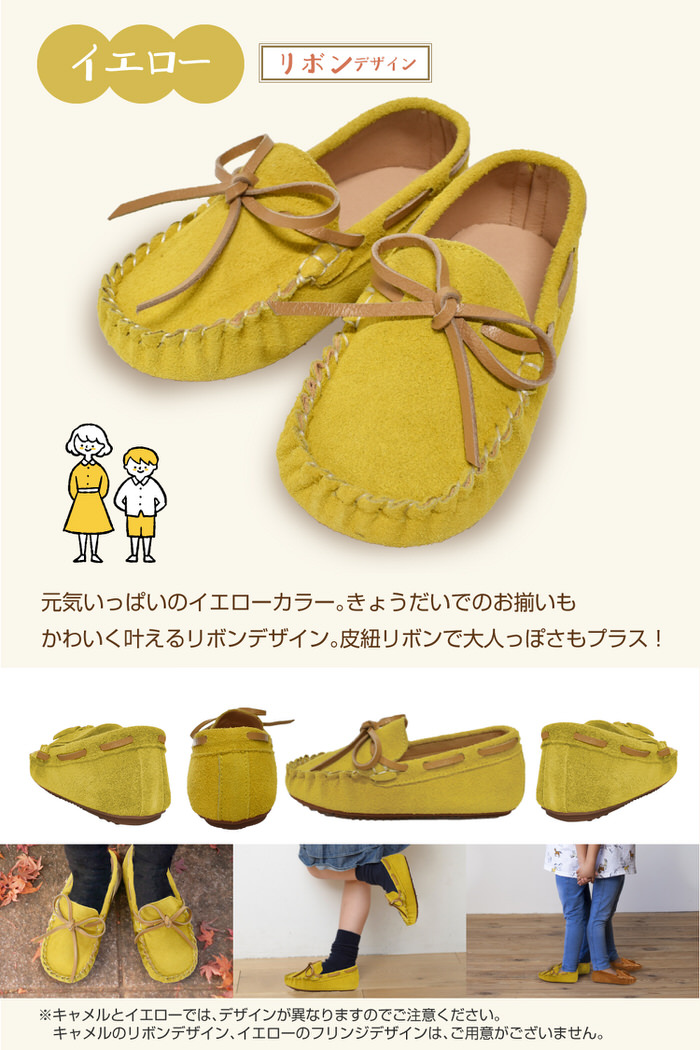 キッズ ローファー モカシン 女の子 女の子 オシャレ ぺたんこ 黄色 イエロー ブラウン 親子 お揃い リボン 軽量