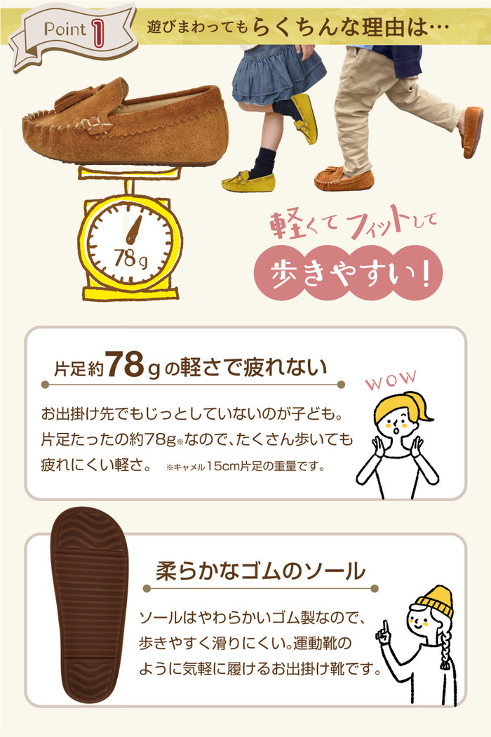 スリッポン型なので、自分で脱ぎ履きしたりママが履かせたりが簡単。甲が深いので、歩いている時は脱げにくい。