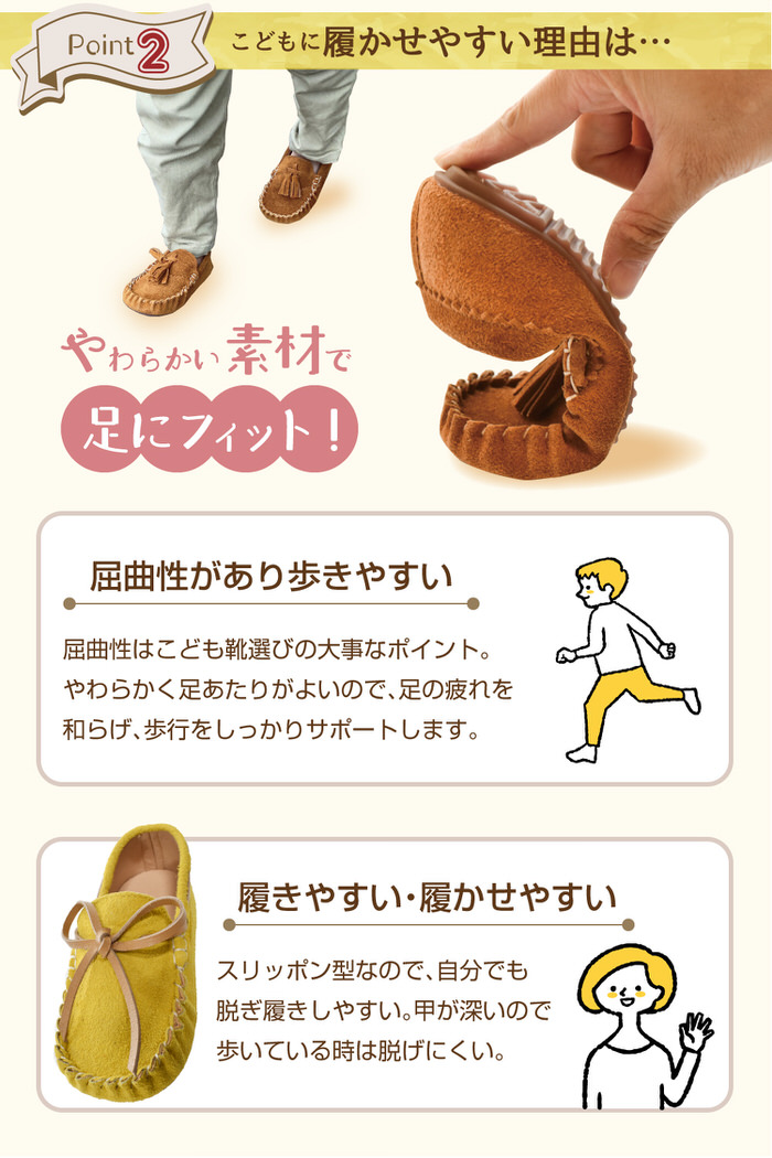 屈曲性はこども靴選びの大事なポイント。やわらかく足あたりがよいので、足の疲れを和らげ、歩行をしっかりサポート。