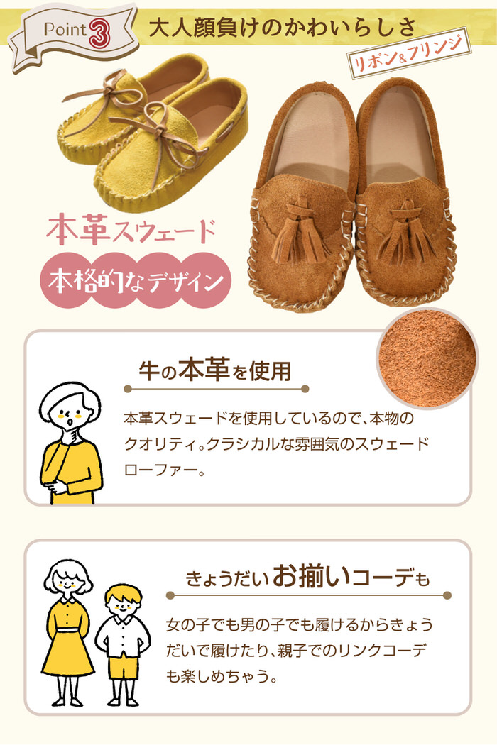 牛の本革を使用しているので、大人顔負けのクオリティ。クラシカルな雰囲気のスウェードローファー。女の子でも男の子でも履けるから、きょうだいお揃いや親子でリンクコーデも楽しめる。