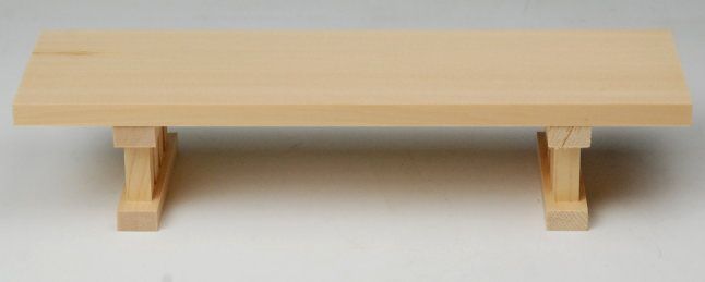 神具七点セットの榊立以外の5点を載せる際には神具七点セットの小サイズ以下を載せる事ができます。白皿2枚と水玉だけの3点を載せる場合は神具七点セットの中サイズまで載せる事ができます。 [外寸]高さ50×巾245×奥行70ミリ[材質]木目のきれいな木曽桧製になります。[お薦めの神棚サイズ]中神明などの一社タイプや屋根違い三社(小)など三社の小型タイプの神棚におすすめです。 ※天然木のため木目や色は多少異なる場合がございます
