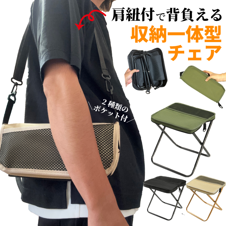 折りたたみ椅子 肩紐付 ポケット コンパクト アウトドアチェア 椅子 軽量 軽い 持ち運び ポータブルチェア 収納 ケース一体型 組み立て 収納付