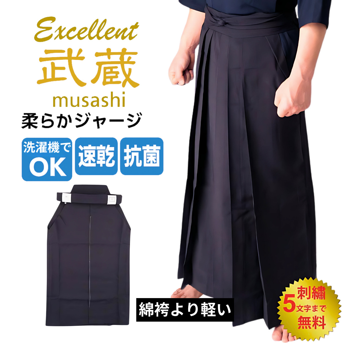 剣道袴 新!上製「武蔵」柔らかジャージ袴 夏用 薄手 軽量 涼しい 抗菌 吸汗 紺 刺繍ネーム5文字まで無料 16号 17号 18号 19号 20号 21号 22号 23号 24号 25号 26号 27号 28号 武道園