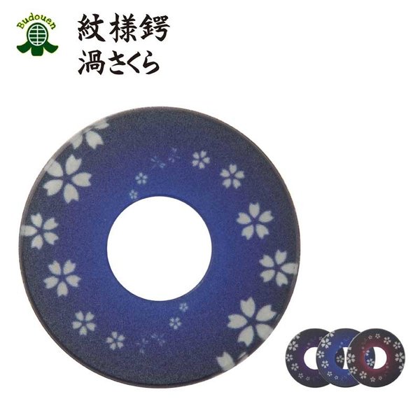 剣道竹刀用鍔です日本製で 渦 さくら 模様 紋様鍔サイズはMとLがあり、カラーは紫、青、赤3色があります。