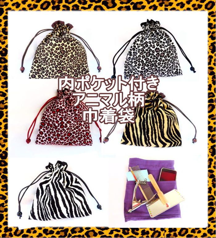おすすめ 内ポケット付き アニマル巾着袋 ひょう柄 ゼブラ 虎 レオパード シマウマ 黒 茶色 ピンク 黄色