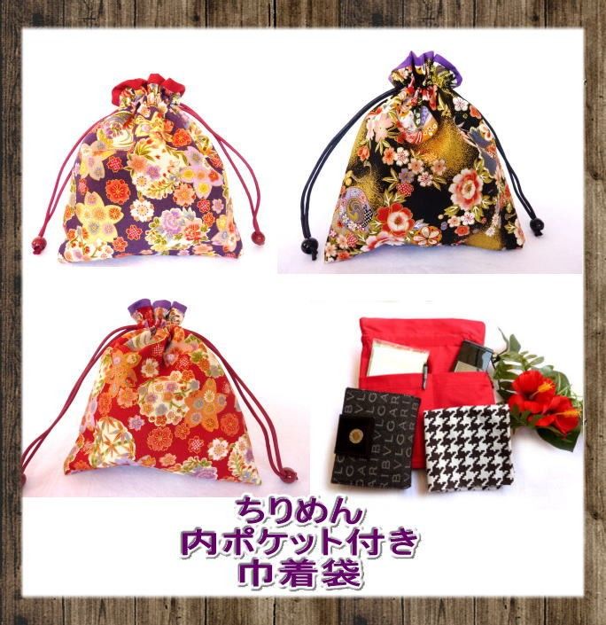 おすすめ 内ポケット付き ちりめん巾着袋 和柄 赤 黒 紫 上品 可愛い