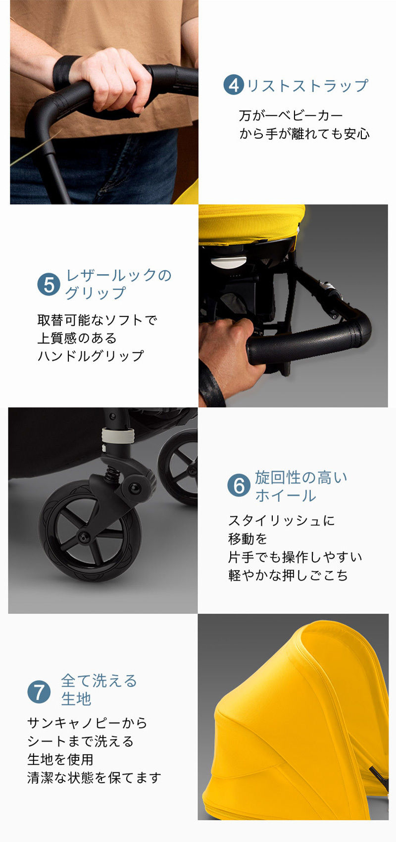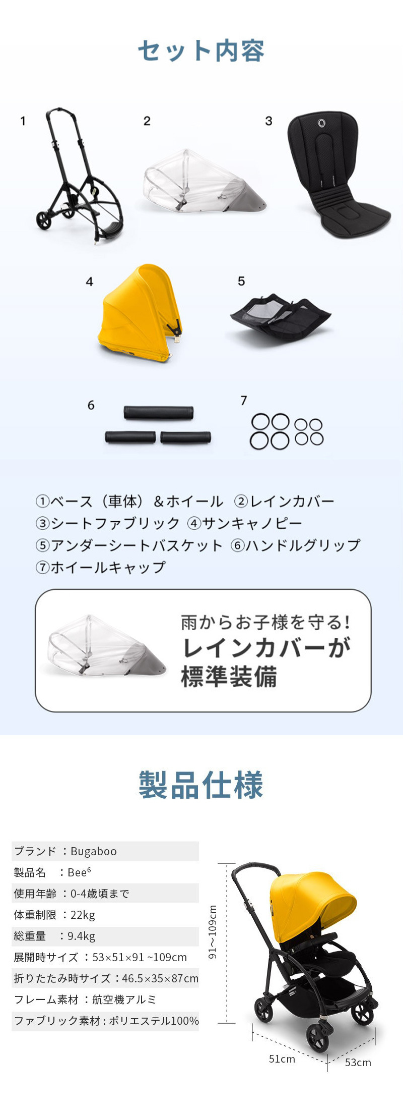 ・サンキャノピー ・レインカバー ・シートファブリック ・ハンドルバーグリップ ・アンダーシートバスケット ・ホイールキャップセット ・シャーシ&ホイール |