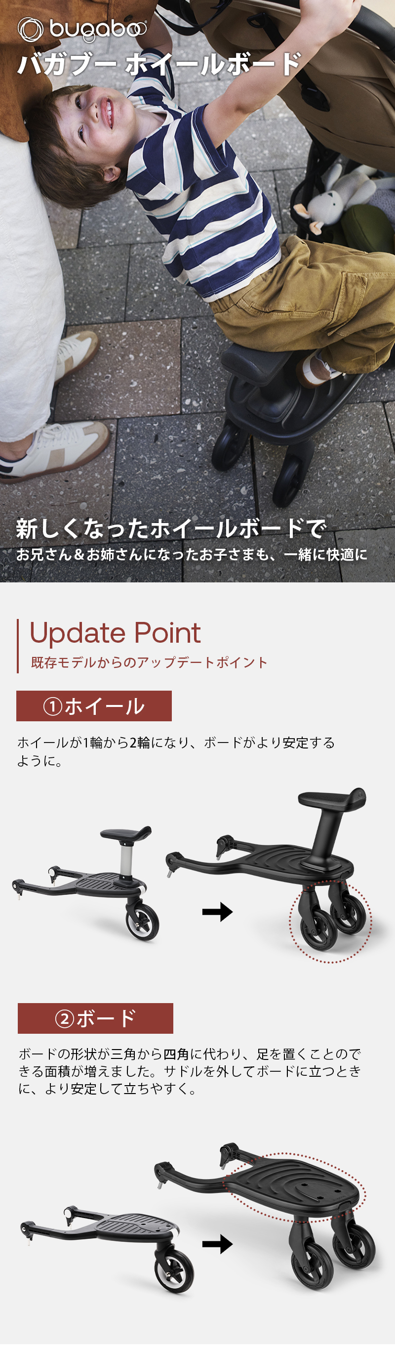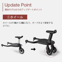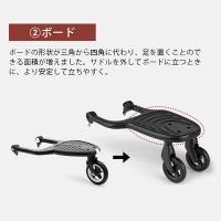 | ・人間工学に基づいたデザイン ・簡単取り付け、取り外し ・使用時にストローラーを押しやすいよう、ボードが左右どちらかに少しずれた位置に設計。 ・ストラップ不要でコンパクトに収納。使わないときは、持ち上げれば垂直の状態に固定 ・立ち乗りも、座りのりもできる快適なサドル(サドルは取り外しも可能) ・ホイールが2輪になり、ボードがより安定するようになりました。 |