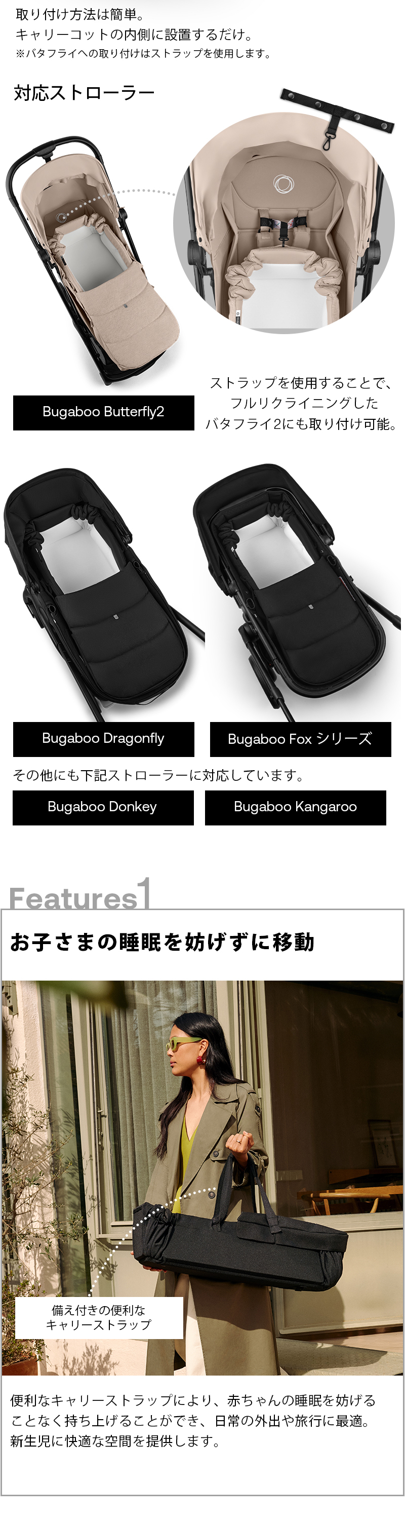 | バガブーすべてのキャリーコットストローラー ※ストラップを使ってフルリクライニングしたバガブーバタフライ2にも固定可能 |