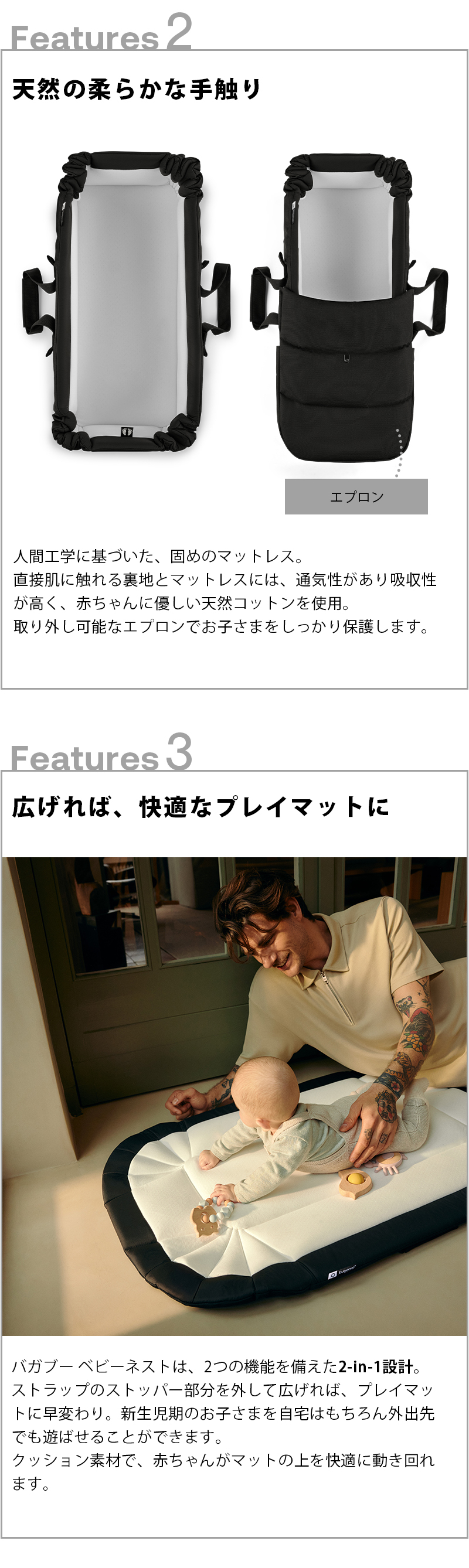 | •ハーネスをお子様の体に留める必要がなく、新生児期に快適な空間を作り出す •手足を自由に動かしたりできる=お子さまの発育に良い環境 •眠っていても、赤ちゃんをそのまま持ち上げて移動させることが可能 •広げればクッション性のあるプレイマットに •丈夫で安全、扱いやすいフレキシブルな構造 •人間工学に基づいて選定したしっかりとしたマットレスと、柔らかく通気性のよい天然コットンの裏地を使用 |