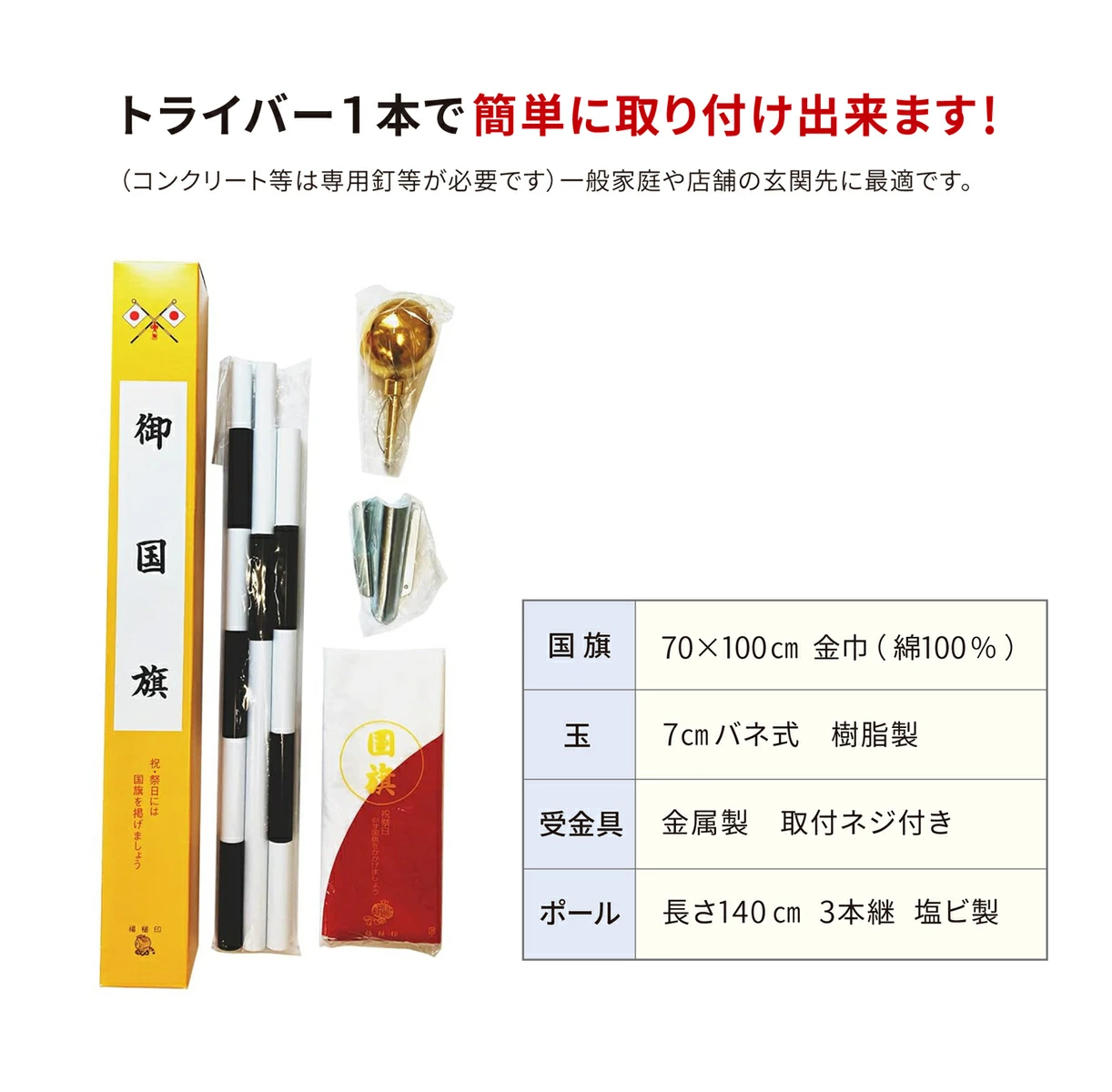 トライバー1本で簡単に取り付け出来ます!(コンクリート等は専用釘等が必要です)一般家庭や店舗の玄関先に最適です。