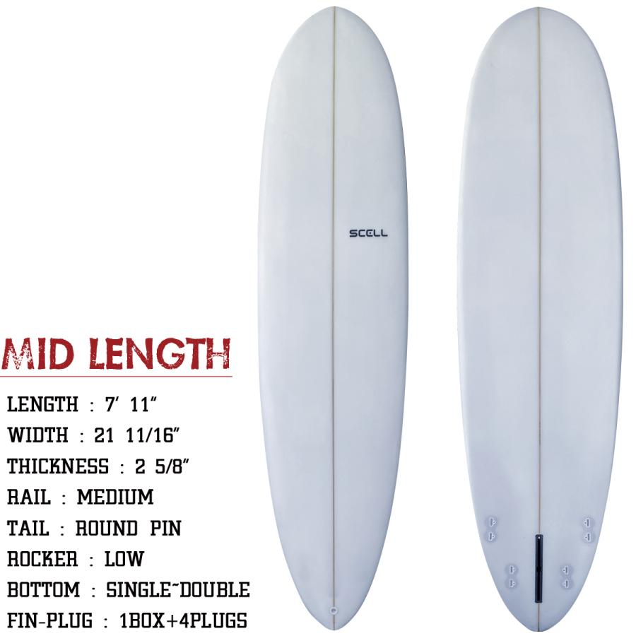 _サーフボード ミッドレングス 7'11 CL MIDLENGTH クリア 白フィン付 トライフィン クアッドフィン センターフィン スタビ 5プラグ FCS