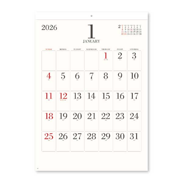 新日本カレンダー 2026年カレンダー シンプル フェイス [535×380mm] 令和8年 壁掛けカレンダー シンプル 上品 ボドニー 六曜 メモスペース NK-194