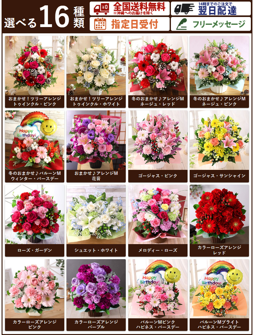 当店人気No1の選べるアレンジメント10種類以上!旬のお花を使ったボリューム感あふれるアレンジです。 記念日や歓送迎などのギフトに是非お使いください!
