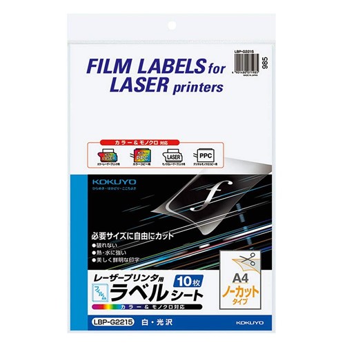| ■ 【A4・ノーカット・10枚】KOKUYO/カラーレーザー&カラーコピー用フィルムラベル LBP-G2215 白・光沢 バリエーション豊かで丈夫なフィルムラベル コクヨ |
