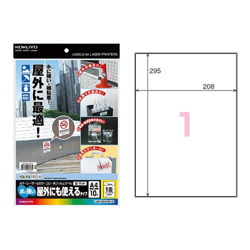 | ■ 【A4・1面・10枚】KOKUYO/カラーレーザー&カラーコピー用フィルムラベル LBP-OD101W-10 白・マット 10枚 耐水性に優れた強粘着タイプ、水まわりや屋外に使用に最適 コクヨ |