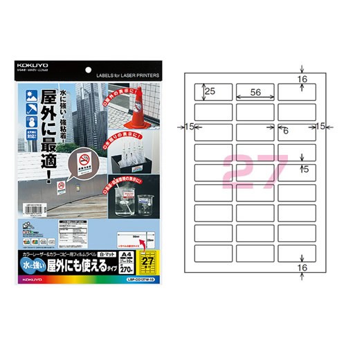 | ■ 【A4・27面・10枚】KOKUYO/カラーレーザー&カラーコピー用フィルムラベル LBP-OD127W-10 白・マット 10枚 耐水性に優れた強粘着タイプ、水まわりや屋外に使用に最適 コクヨ |