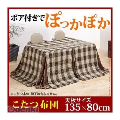 【この商品はメーカー直送となります。お支払い方法選択画面では「代金引換」が表示されていますが、ご利用できません。カード・銀行振込でお支払い可能です。】※こちらの商品は沖縄・離島への販売は承っておりません。ご了承ください。 オススメこたつサイズ(約):135x80cm 【仕様】 表地:綿100% 裏地:アクリル100%(ボア) 中綿:ポリエステル100% 【サイズ】 295x240cm 重量:中綿約1.35kg ポケット:12x16cm コード穴:約10cm