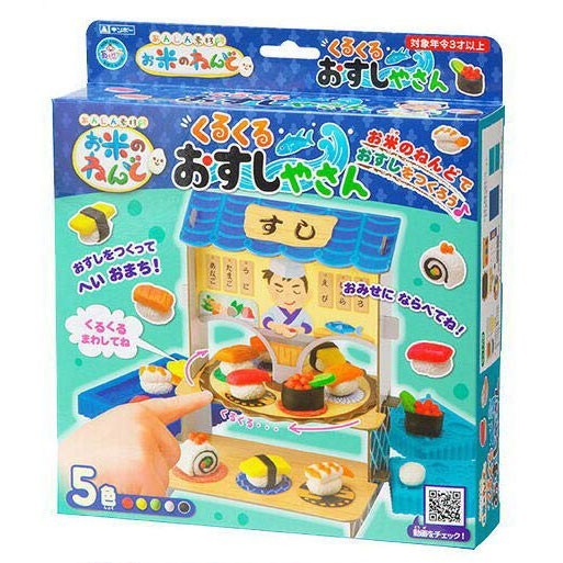 お米でつくった安心素材の ねんど5色 と 押し型、お店が入ったセットです。押し型を使って、ねんどで本物みたいなおすしが作れます。お家族やお友達と楽しくおすし屋さんごっこができます。