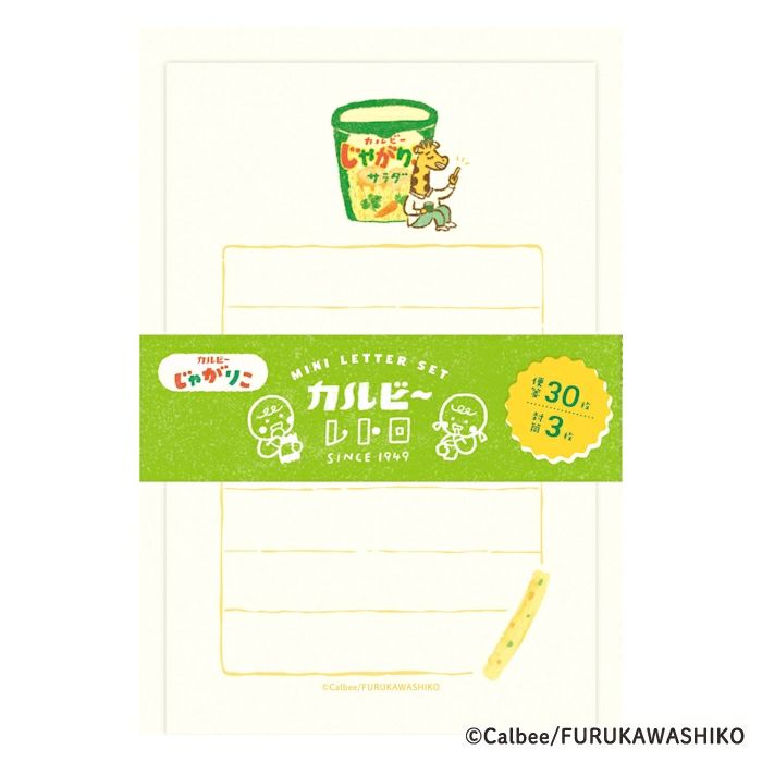 あの大人気のお菓子たちが、かわいくレトロなイラストになった「カルビーレトロ」シリーズ。美濃和紙製のミニレターセットです。柔らかな美濃和紙の風合いに、手書きのパッケージとキャラクターのワンポイントがマッチ。メッセージにも、デコにも大活躍です。■内 容:便箋 30枚綴り、封筒 3枚入■サイズ:便箋 H114×W73mm、封筒 H82×W120mm■素 材:美濃和紙