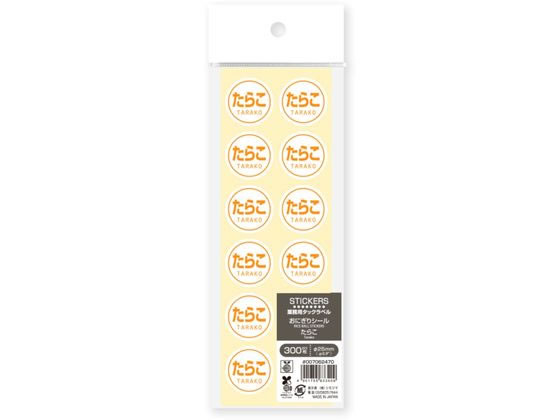 【商品説明】業務用タックラベル・おにぎりシール。食品のフレーバー表示に便利です。【仕様】●おにぎり用表示シール・たらこ●サイズ(シール1個あたり):直径25mm●材質:光沢紙・バイオマスインキ10%●入数:300枚(12枚/1シート×25シート)●注文単位:1パック(300枚)