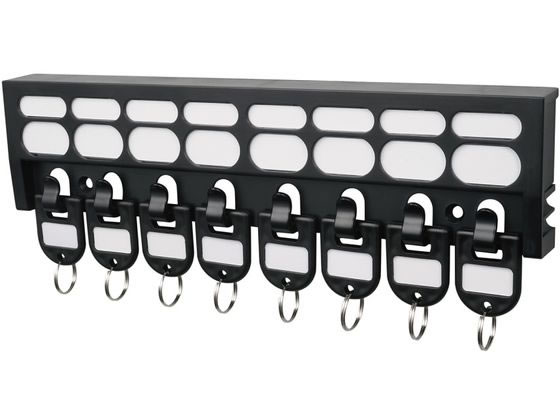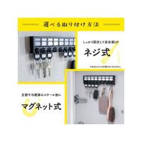 【商品説明】ご家庭やオフィスでの鍵の管理に最適なキーハンガーです。玄関扉やガレージ、スチールデスク、冷蔵庫などに取り付けでき、鍵を管理できます。背面にはマグネットが付いているのでスチール面にしっかり取り付けられます。壁掛け用のネジ穴もついているので場所を選ばずご使用いただけます。名前が書けるネームシート付きで鍵の取り間違えを防止します。【仕様】●サイズ:幅248×奥行23×高さ103mm(キーホルダー装着時)●重量:95g●材質:ABS●セット内容:キーハンガー×1個、キーホルダー×8個●鍵吊数:8個●色:ブラック●壁掛け用穴付き(2箇所)●マグネット付き●名前が書けるネームシート付き●注文単位:1個