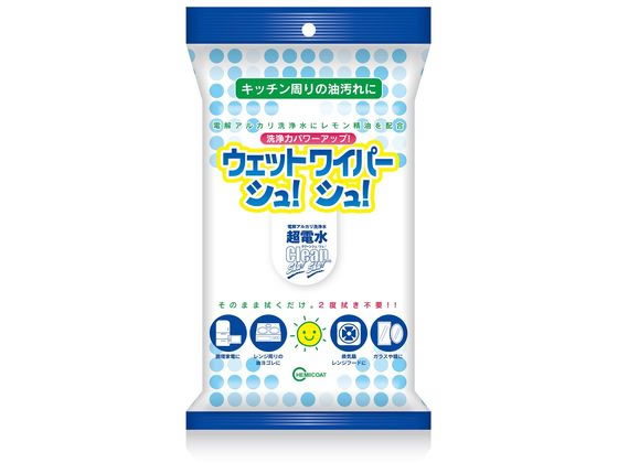 【商品説明】超電水とレモン精油のダブル洗浄パワーでしつこい油汚れも落とします。 超電水では落ちなかった汚れも、ウェットワイパーで一拭き。 床や壁に付いてしまったクレヨンも落とすことができます。 厚手で破れにくく、色々な場所のお掃除に最適です。 保湿成分にスクワランを配合しているので、手荒れの心配もありません。 お掃除しやすい大判サイズ。【仕様】●液性:アルカリ性 ●シートサイズ:200×300mm ●材質:レーヨン・ポリエステル ●成分:電解アルカリ水(超電水クリーンシュ!シュ!)、アルコール系溶剤、スクワラン(保湿剤)、レモン製油(除菌剤) ●内容量:20枚