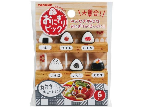 【商品説明】お弁当を楽しく飾るおにぎりピックです。 塩・梅干し・いくら・ごま塩・こんぶ・天むすの6種類、各1本ずつ入りです。【仕様】●商品サイズ:塩/約46×17.5×10.5mm、梅干し/約46×17.5×11mm、いくら/約46×17.5×11mm、ごま塩/約46×17×10.5mm、こんぶ/約46×17.5×11mm、天むす/約46×17.5×11mm ●材質:ABS樹脂 ●耐熱温度:70度 ●耐冷温度:−20度 ●注文単位:1パック(6本) 【使用上の注意】 ・電子レンジ、オーブン、食器乾燥機、食器洗い乾燥機等でのご使用はおやめください。 ・誤飲の危険がありますので、乳幼児には絶対に与えないで下さい。 ・冷凍庫でのご使用はおやめください。