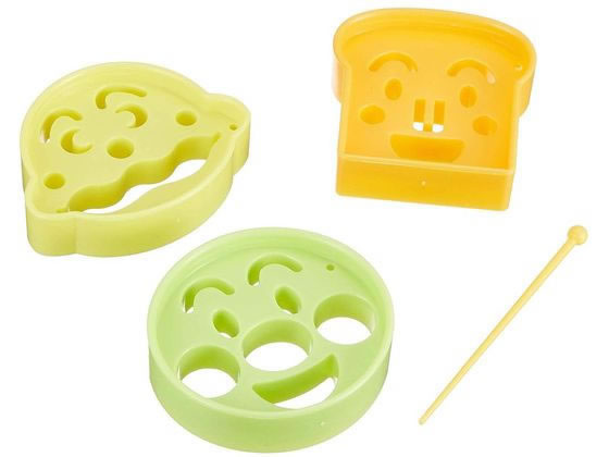 【仕様】●アンパンマン:約51×54×14mm カレーパンマン:約46×58×14mm しょくぱんまん:約50×48×14mm ピック:約67×5×5mm ●入数:3個(ピック1本付) ●セット内容:ぬき型(アンパンマン・カレーパンマン・しょくぱんまん)各1個、ピック1本 ※商品により、色と柄の組み合わせが異なります。 耐熱温度:80度 耐冷温度:−30度 ●材質:スチロール樹脂 【使用方法】 (1)野菜・ハム・チーズなどお好きな食材を抜きたい型の大きさに合わせて薄く(3ミリ以下)切ります。※のりはご使用できません。 (2)切った食材の上に、抜き型を置き、手で押さえてください。 (3)付属のピックで食材を押し出してください。 (4)顔型おかずの出来上がりです。お好みでおむすびや他のおかずの上に乗せて使用しましょう。 【注意事項】 ・おかず抜きは必ず保護者の方が行なってください。 ・ピックは機能上、とがっていますので、危険です。本品を使用目的以外にはご使用にならないでください。 ・電子レンジ、オーブン、食器乾燥機、食器洗い乾燥機等でのご使用はおやめください。