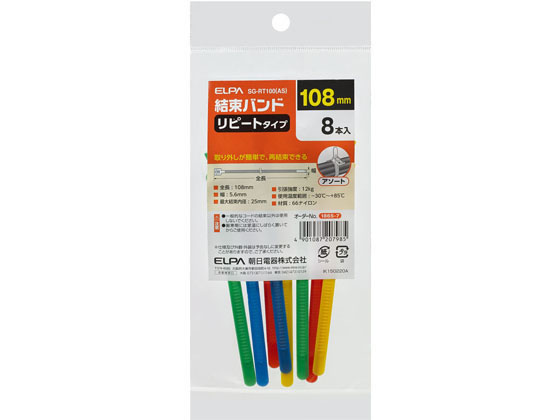 【商品説明】●リピートタイプ●取り外しが簡単で、再結束できる【仕様】●全長:108mm●幅:5.6mm●最大結束内径:25mm●引張強度:12kg●使用温度範囲:−30℃〜+85℃●材質:66ナイロン●8本入●カラー:アソート